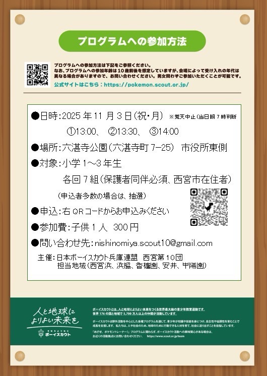 2025年10月12日 / 最終更新日 : 2025年10月13日 nishinomiya-bs10 体験会連絡 2025年11月3日🎌(月) めざせポケモントレーナー@六湛寺公園 一般向けに案内を開始しました。お申し込みはQRコードから。参加をお待ちしております!